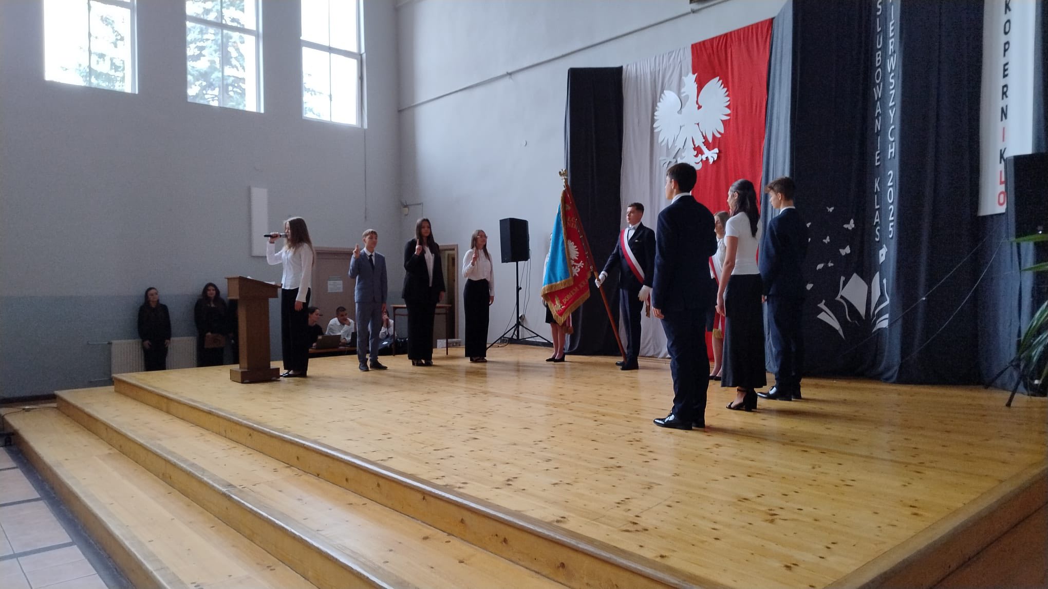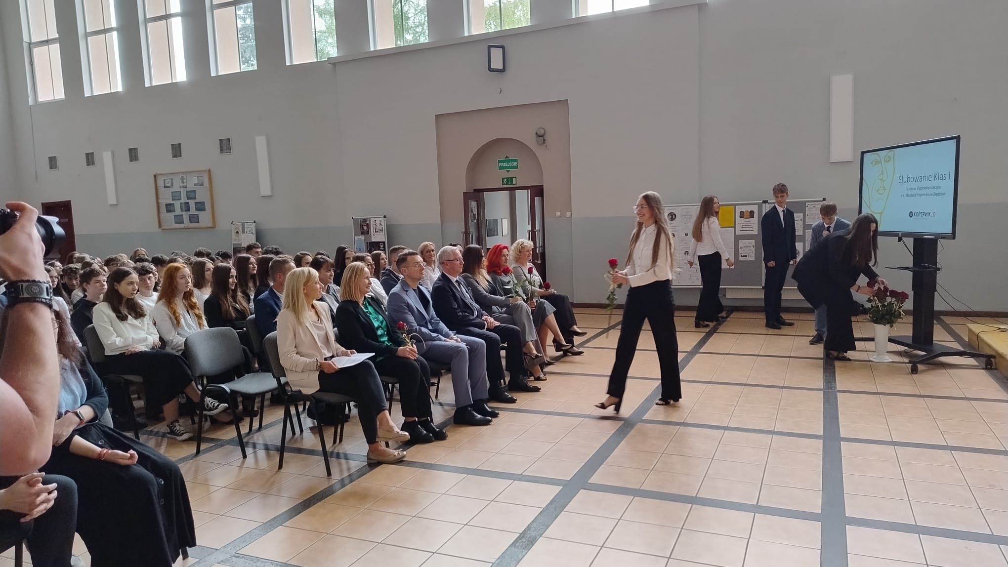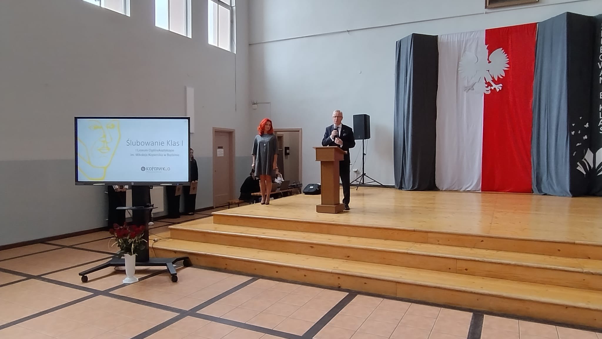 Starostwo Powiatu Będzińskiego oraz Pani Katarzyny Pietrzyk – przewodniczącej Rady Rodziców I LO im. M.Kopernika, młodzież złożyła przyrzeczenie na sztandar szkoły. Uczniowie zobowiązali się do sumiennej pracy, przestrzegania zasad moralnych i obywatelskich oraz do nieustannego rozwijania swoich talentów i osobowości.
