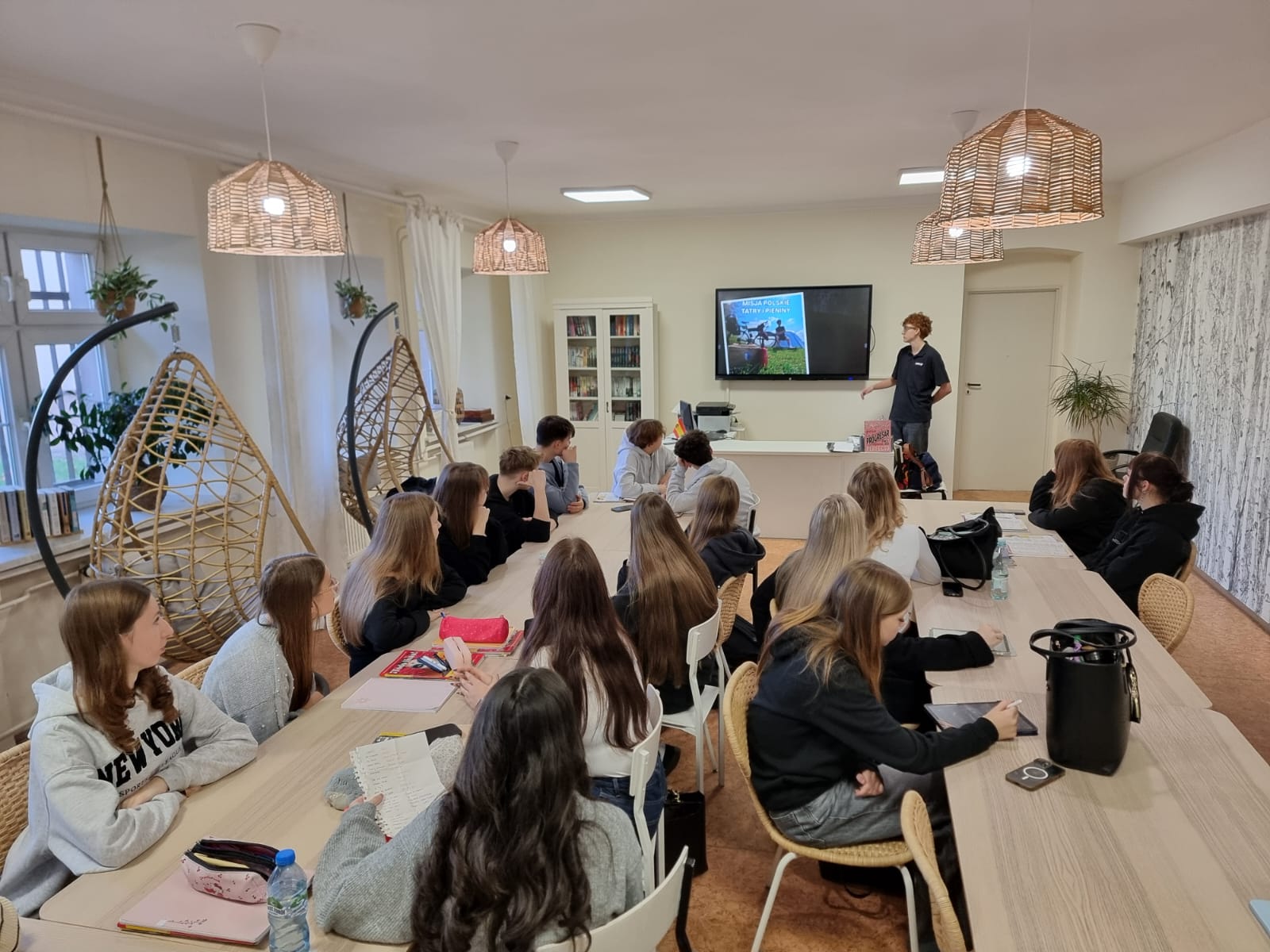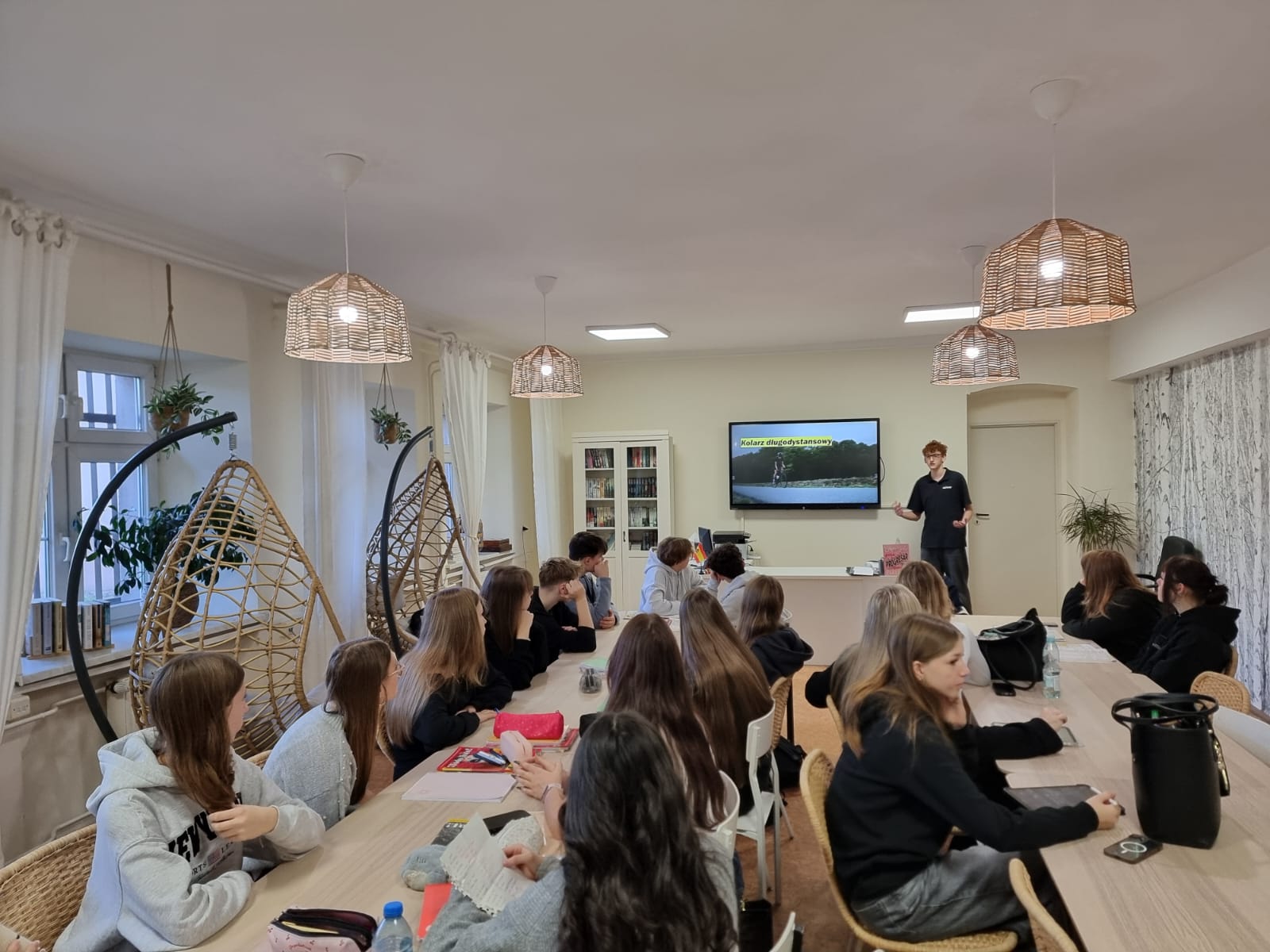 Pod tym inspirującym mottem w szkolnej bibliotece odbyło się spotkanie uczniów klas Ic i IVs z wyjątkowym gościem – Tobiaszem Bieńkiem, uczniem klasy IVs, a zarazem kolarzem długodystansowym