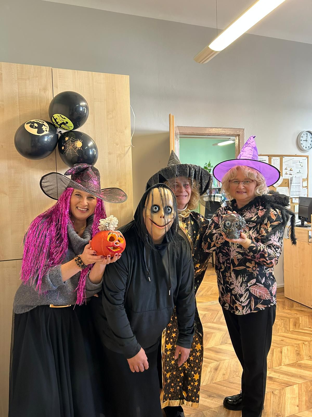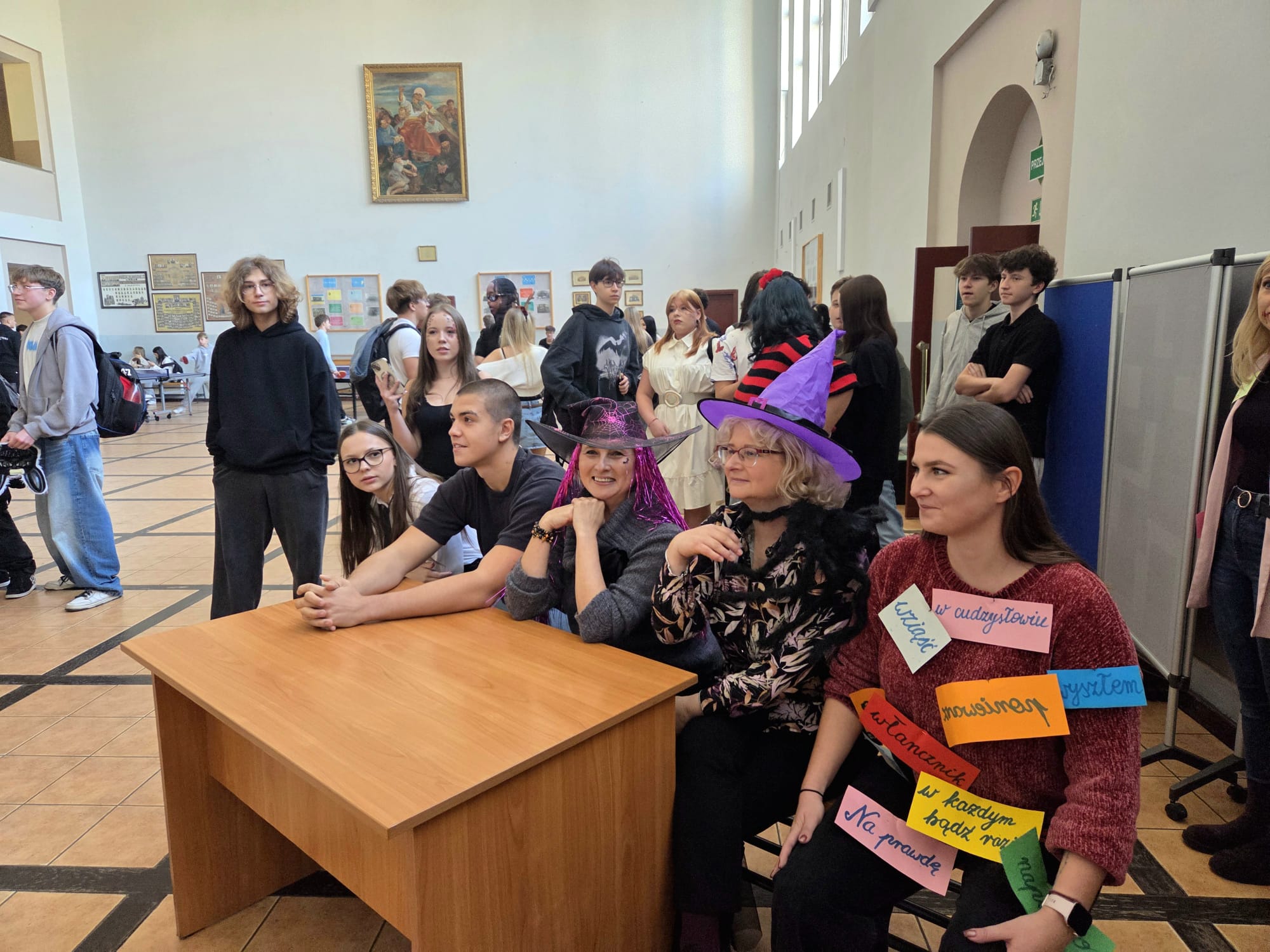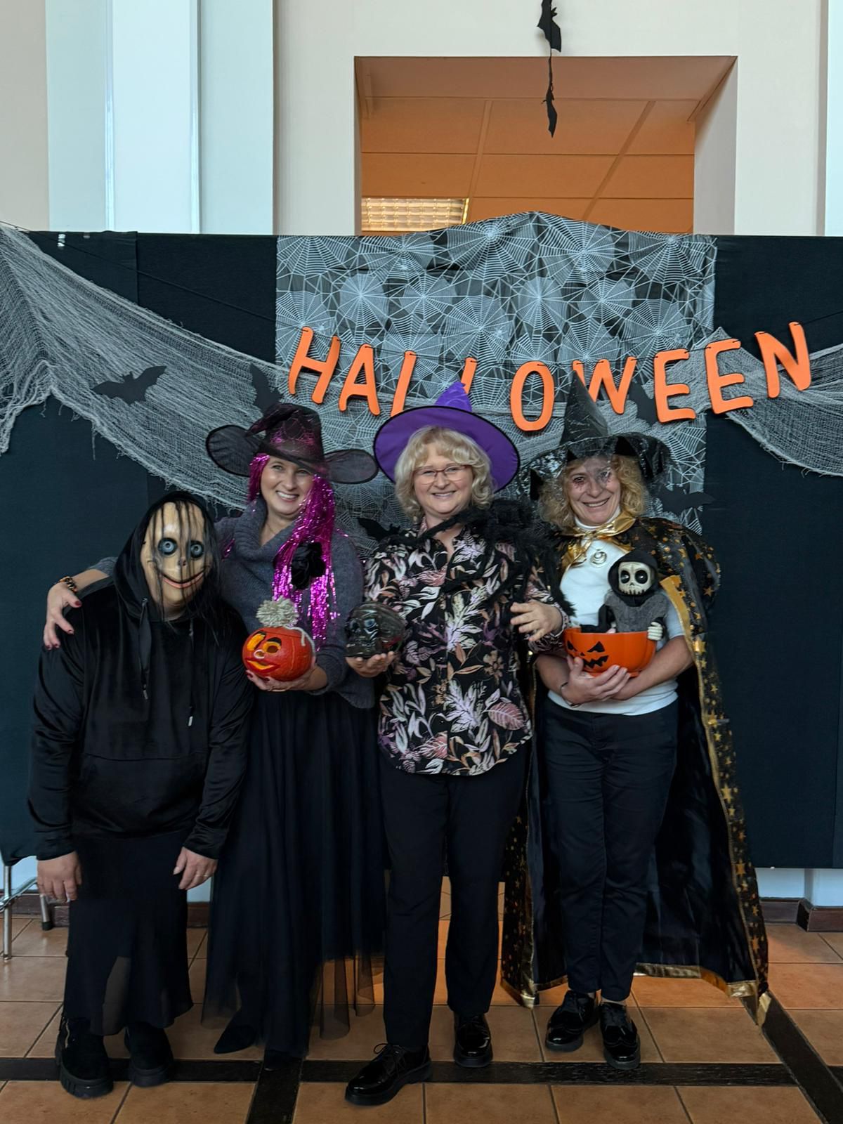 31 października w naszej szkole zapanował prawdziwie magiczny klimat! Korytarze wypełniły się upiornymi przebierańcami, zapachem słodkich babeczek i… śmiechem, który przegonił nawet najstraszniejsze duchy. Uczniowie mogli odwiedzić kącik strasznych piękności, gdzie czekały na nich wyjątkowe stylizacje i malowanie twarzy rodem z filmów grozy. W stoisku wróżb można było poznać swoją przyszłość, a łasuchy miały okazję spróbować pysznych halloweenowych wypieków.