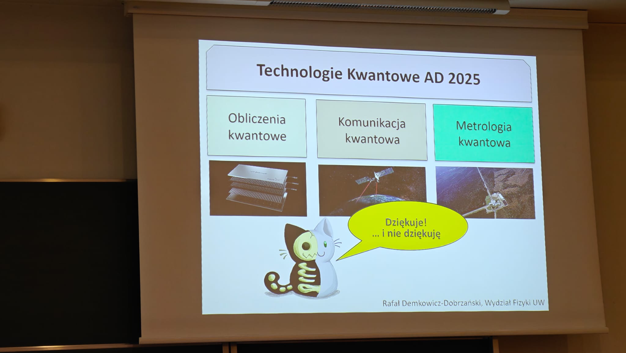 Koty Schroedingera w detektorach fal grawitacyjnych to wykład poprowadzony przez prof. Rafał Demkowicz-Dobrzański z Uniwersytetu Warszawskiego Wykład skupiał się na falach grawitacyjnych, ich detektorach – gigantycznych interferometrach optycznych, które pozwalają na wykrycie fal grawitacyjnych, które `rozciągają przestrzeń’ o odległość mniejszą niż rozmiar protonu! W roku 2015 po raz pierwszy dokonano bezpośredniej detekcji fal grawitacyjnych. Od roku 2019 detektory rutynowo używają splątanych stanów światła, które dodatkowo poprawiają i dokładność tych i tak „astronomicznie” dokładnych urządzeń. Dowodzi to, że koty Schroedingera są jednak ostatecznie pożytecznymi istotami!