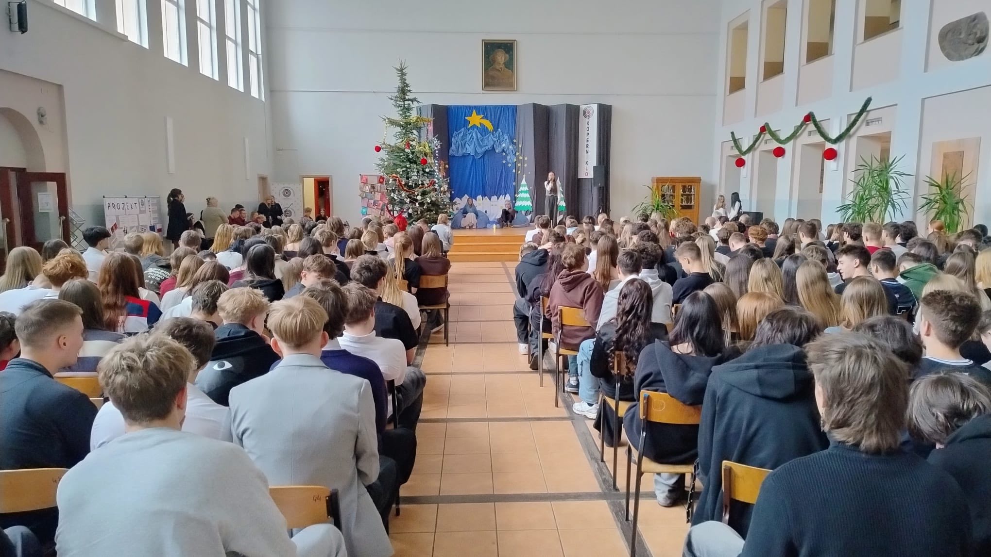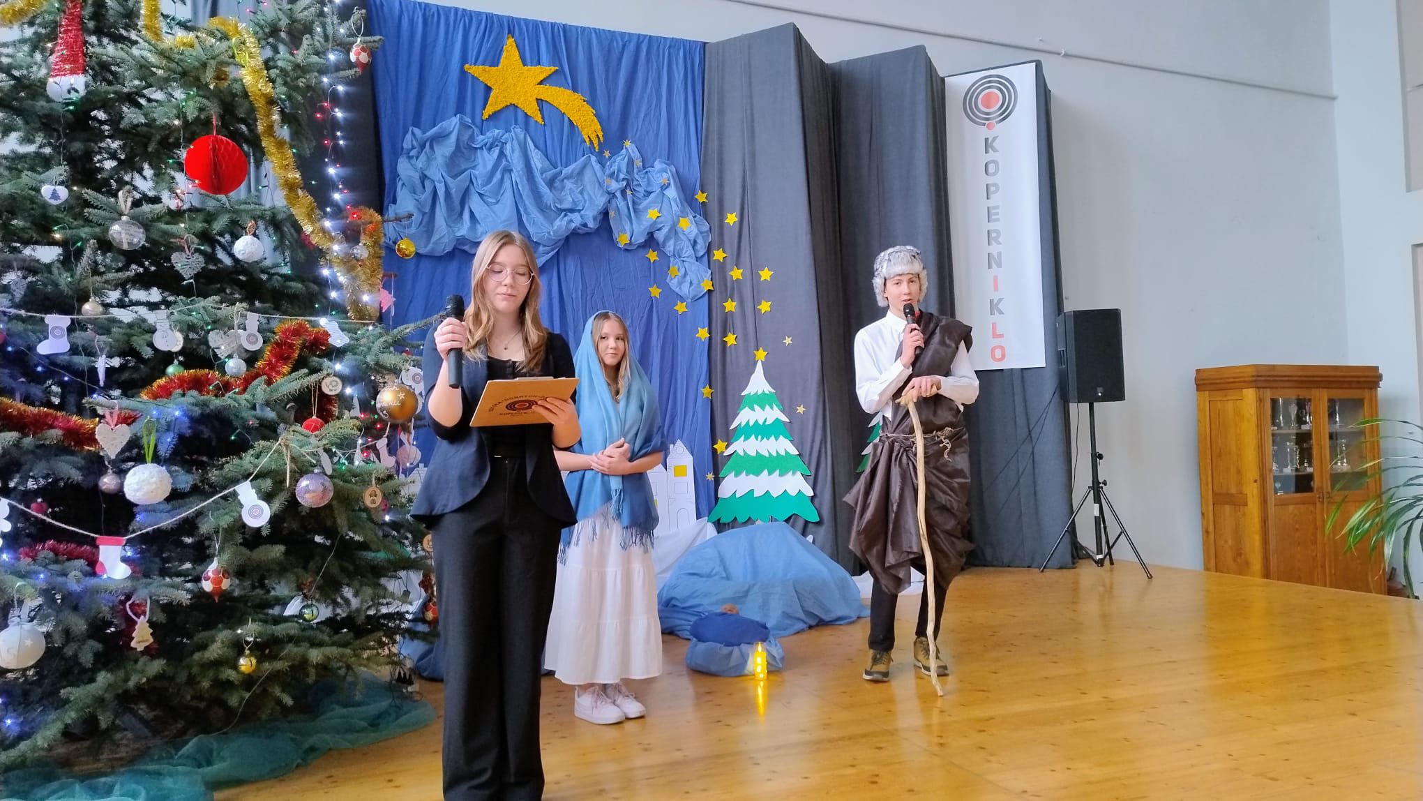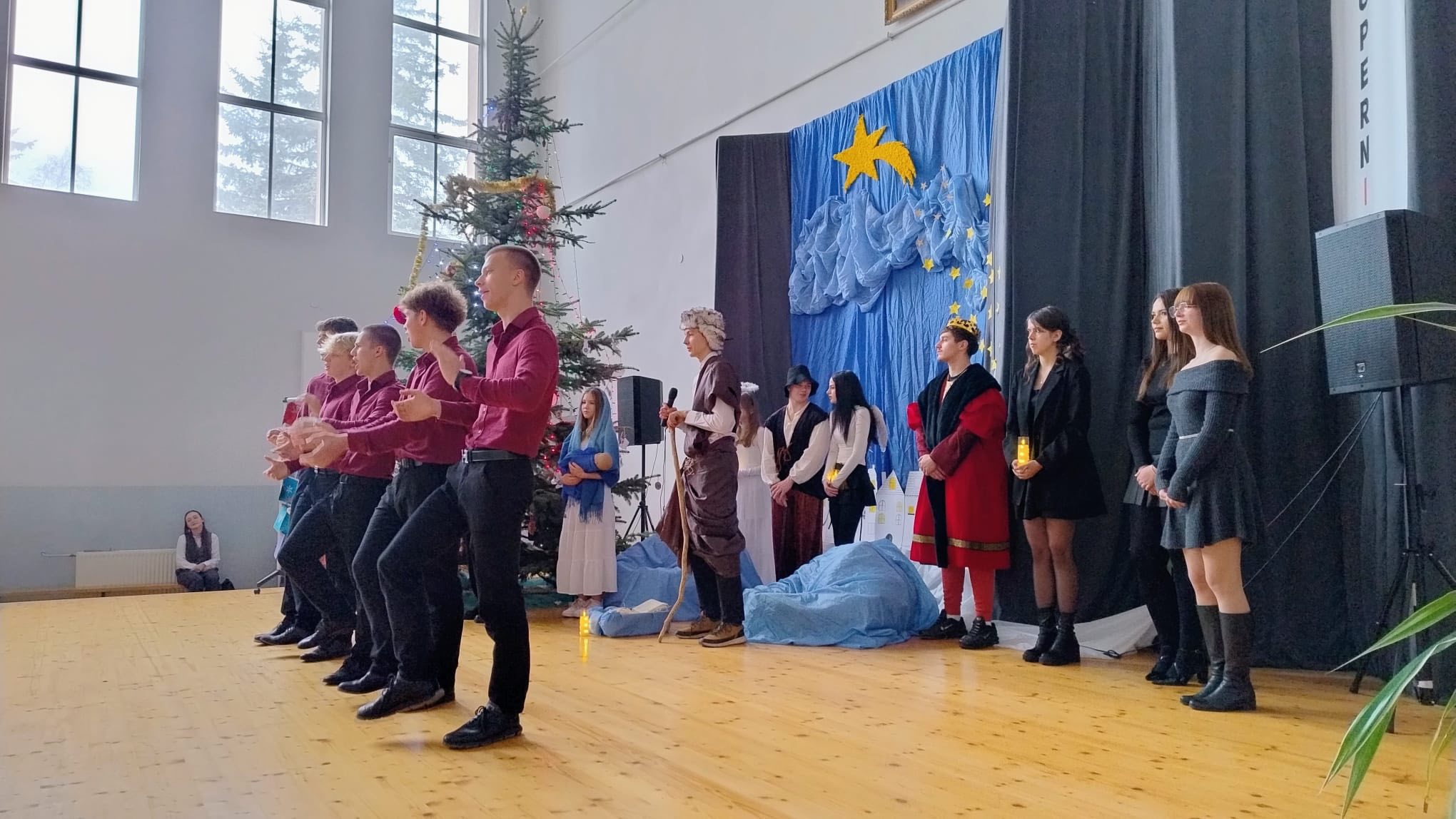 W dniu 19 grudnia młodzież zaprezentowała jasełka pt. „Światło w naszym świecie”, które niosły piękne i poruszające przesłanie: czasami wystarczy otwarte serce, by dostrzec światło w codzienności. Przedstawienie zostało uświetnione kolędami o Narodzeniu Jezusa, wprowadzając wszystkich w wyjątkową, świąteczną atmosferę. Na zakończenie pani dyrektor – Anna Adamczyk oraz pani wicedyrektor – Agnieszka Marciniak, złożyły serdeczne życzenia, życząc wszystkim zdrowych, spokojnych i pełnych radości Świąt Bożego Narodzenia.