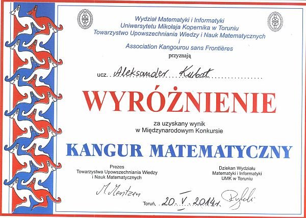 Nasz uczeń – Aleksander Kubat z klasy 1A otrzymał WYRÓŻNIENIE.